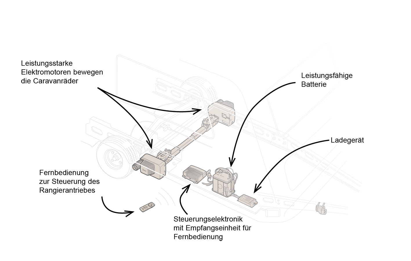Kraftvolle Elektromotoren benötigen für die Bewegung eines Caravans eine sehr hohe Strommenge – für den Betrieb eines Rangierantriebes wird daher eine 12-Volt-Stromversorgung benötigt, eine Bordbatterie. Doch im Gegensatz zu normalen Bordbatterien, die über längere Zeiträume kleinere Ströme für Licht, Wasserpumpe usw. liefern sollen, wird beim Rangieren ein hoher Strom über eine kurze Zeitdauer (ca. 10 bis 20 Minuten) benötigt. Bewährt haben sich hierfür AGM-Batterien mit Spiralzellentechnologie. Sie liefern hohe Ströme, tolerieren aber auch geringere Stromentnahmen über einen längeren Zeitraum, beispielsweise beim autarken Campen.Um die Batterie leistungsfähig und voll geladen zu erhalten, wird zudem ein Ladegerät benötigt. Sobald der Caravan an den Landstrom angeschlossen wird, lädt es die Batterie wieder auf. Spezielle Kombigeräte übernehmen darüber hinaus nicht nur die Nachladung am 230-Volt-Anschluss, sondern regeln über eine Boosterfunktion die Ladung sogar während der Fahrt, wenn Strom von der Lichtmaschine des Zugfahrzeuges zur Bordelektronik des Caravans fließt.